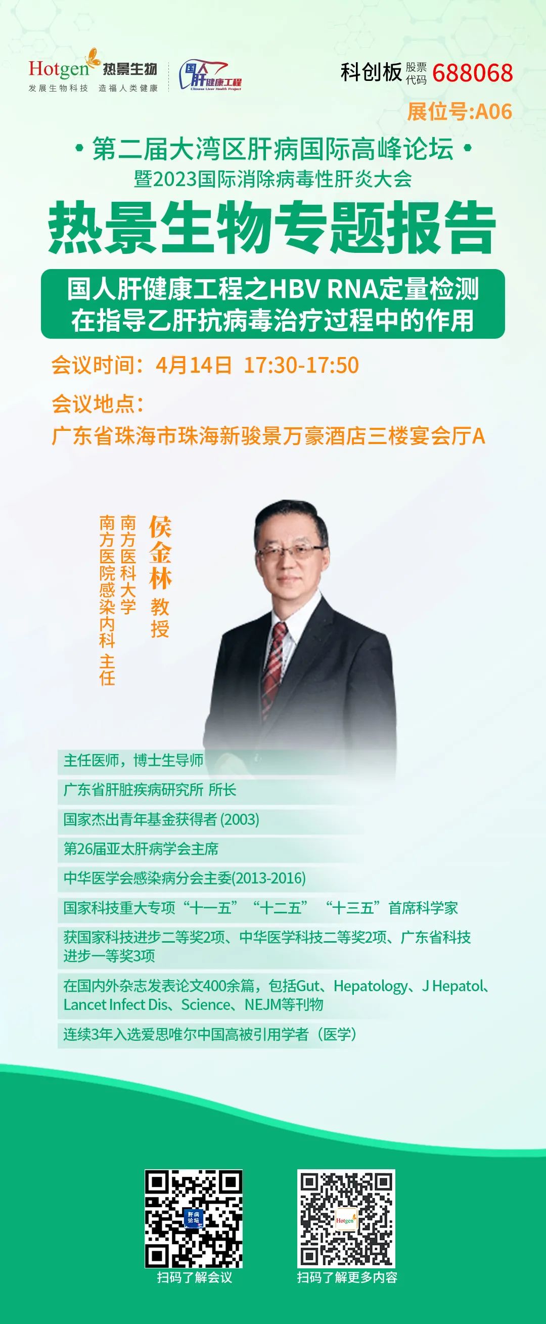 4月14日下午17:30-17:50,南方醫(yī)科大學(xué)南方醫(yī)院感染內(nèi)科主任侯金林教授受邀進行熱景生物專題研討會《國人肝健康工程之HBV RNA定量檢測在指導(dǎo)乙肝抗病毒治療過程中的作用》。